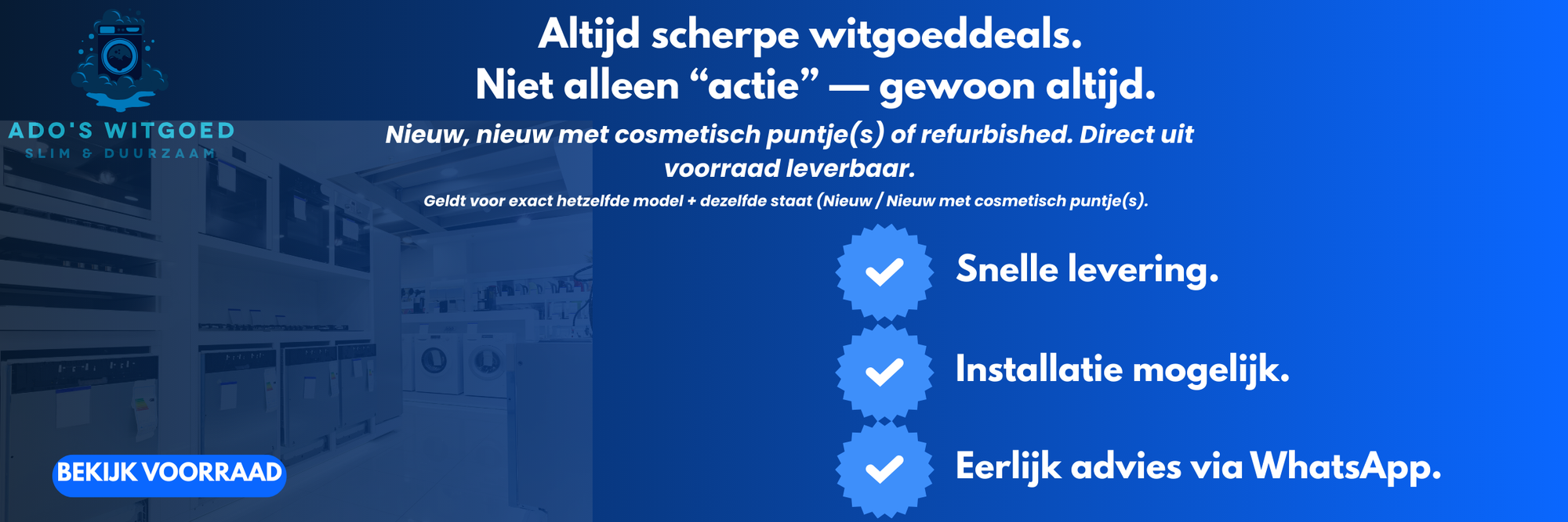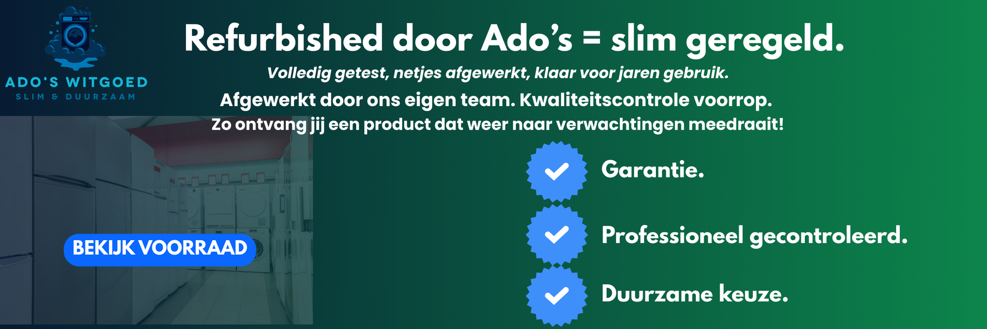 Bij Ado’s Witgoed combineren we topkwaliteit met persoonlijke service. Of je nu kiest voor een gloednieuw apparaat of een zorgvuldig gecontroleerde refurbished machine — je krijgt altijd garantie, eerlijk advies en snelle levering door onze eigen bezorgers. Onze missie? Slim, duurzaam en betaalbaar witgoed voor iedereen. 💙