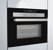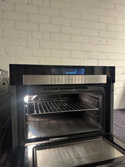 Compacte inbouw combi-oven van 45 cm hoog met multifunctionele oven en magnetronfunctie; Fast-Cook-technologie die oven- en magnetronwarmte combineert voor tot circa 40–50% snellere bereiding dan in een standaard oven; circa 44 liter ovenruimte met drie inschuifposities; 10 functies waaronder hetelucht/fan heating, eco-hetelucht, volgrill, halfgrill, warmhouden, ontdooien, alleen magnetron, magnetron + hetelucht, magnetron + grill en gecombineerde magnetron/hetelucht/grill-standen; ChefAssist-functie met tientallen voorgeprogrammeerde recepten die automatisch tijd, temperatuur, functie en inschuifniveau bepalen; geanimeerd LCD-tekstdisplay met tiptoetsbediening en elektronische temperatuurregeling; drievoudig glas in de ovendeur voor betere isolatie; halogeen-ovenverlichting en grijs easy-clean emaille binnenruimte; geleverd met draadrooster en bak-/kookplaten; energieklasse A met typisch verbruik rond 0,71 kWh bij hetelucht; aansluitwaarde circa 3600 W op 220–240 V met aanbevolen 16 A-zekering; ontworpen voor inbouw in een nis van ongeveer 450 × 560 × 550 mm (h×b×d).