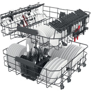 Deze vaatwasser heeft plaats voor 14 couverts. Technisch betekent dat een volwaardige 60 cm kuip waarin je borden, kommen, pannen en glaswerk in één ronde kwijt kunt. Het voordeel merk je direct: je draait minder vaak en je aanrecht blijft sneller leeg. Praktijkvoorbeeld: na het koken laad je pannen en grote borden onderin, servies en glazen bovenin, en je hoeft niet meer te schuiven of iets te laten staan “voor later”.