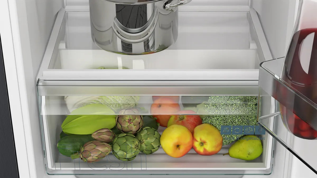 De Siemens KI32LNSE0 behoort tot de iQ100-serie en is een compacte inbouw koel-vriescombinatie met sleepdeur-montage (de meubeldeur wordt gekoppeld aan de koelkastdeur via geleiders), wat zorgt voor een naadloze integratie in je keukenfront.